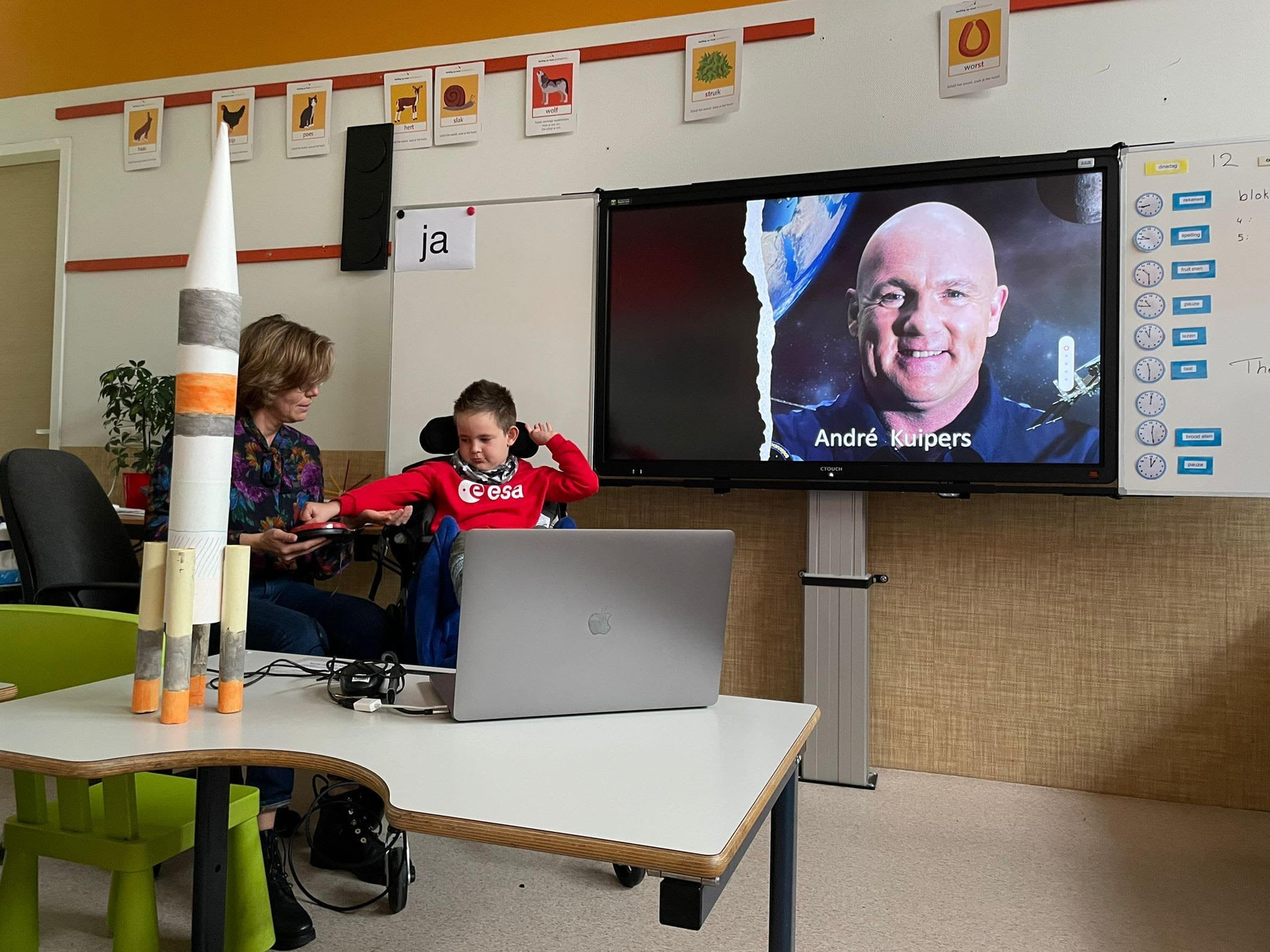 Dit jaar mogen de kinderen ook een spreekbeurt houden over een onderwerp die ze leuk vinden. En Daan heeft hiervan de aftrap gedaan afgelopen week. Hij is samen met Tante Rineke (zijn begeleider op dinsdag en vrijdag) al weken bezig geweest met de voorbereidingen. Uiteraard ging de spreekbeurt over de ruimte en Andre Kuipers. Daar heeft Daan veel kennis over en genoeg boeken in huis om hier een mooie spreekbeurt over te maken.