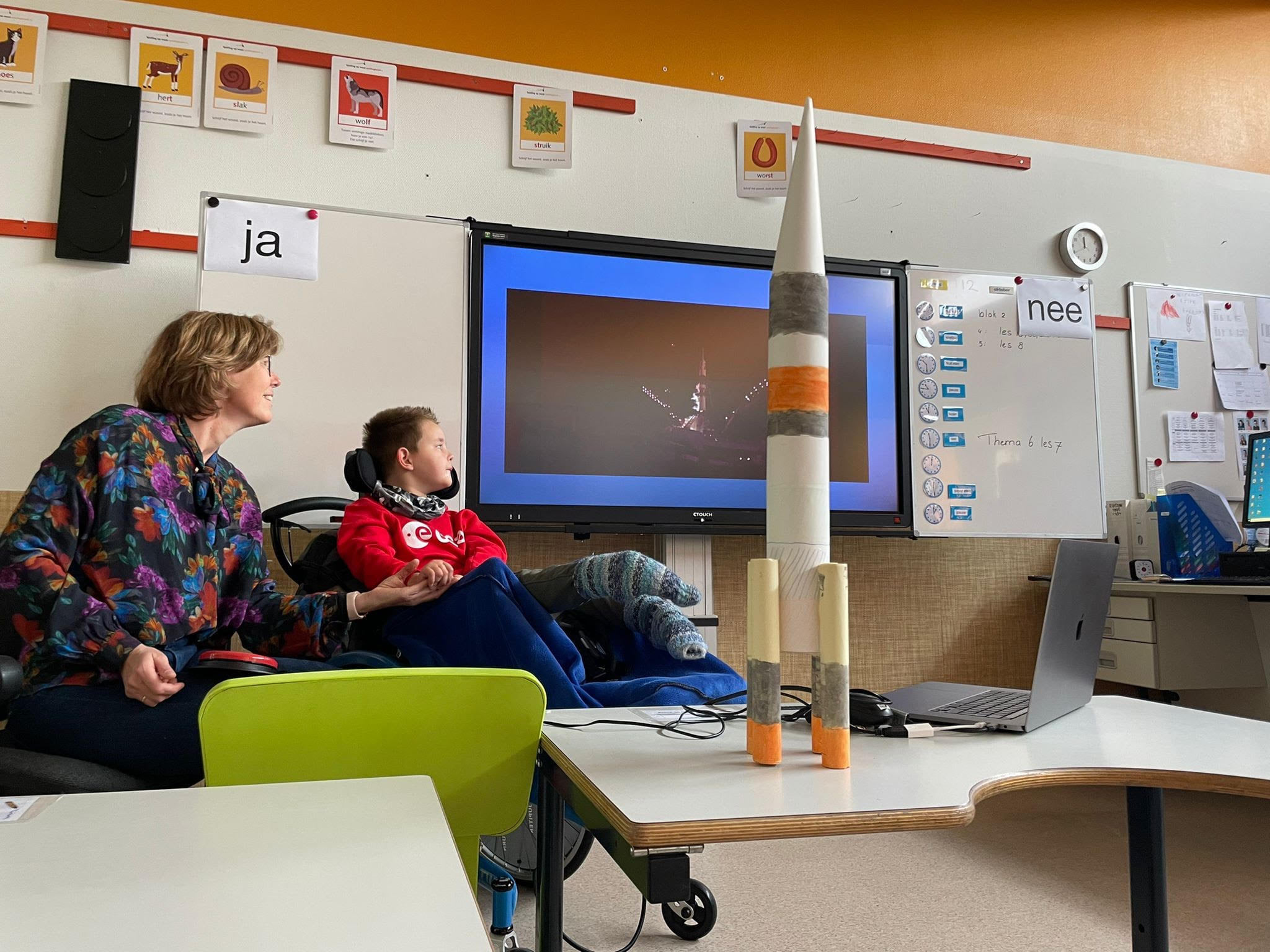 Maar als je niet kunt praten is een spreekbeurt houden natuurlijk wel erg lastig. Maar Tante Rineke is niet voor 1 gat te vangen en die is daar creatief mee aan de slag gegaan. Samen met een ICT’er van school zijn ze opzoek gegaan naar de mogelijkheden. Zo kwamen ze op een grote knop die je aan de computer kunt koppelen, die Daan makkelijk kan indrukken. Bij elke druk van Daan komt dan de volgende slide in beeld. Zijn begeleider had zijn tekst voor hem ingesproken en zo werd de tekst dan verteld bij elke druk die Daan op de knop deed. Fantastisch he!